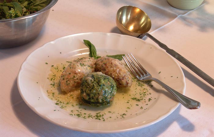 Knödel in vielen Variationen von den Wirtsleuten geschmacksvoll zubereitet. Fleisch, Gemüse und Kräuter kommen großteils vom eigenen Bauernhof. Sehr beliebt: Törggelen im Herbst mit dazu